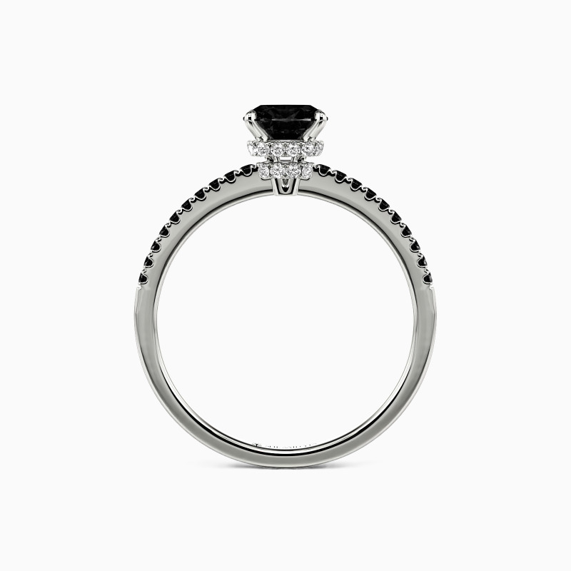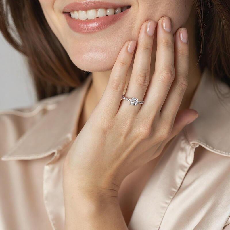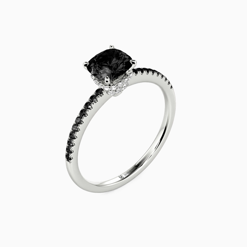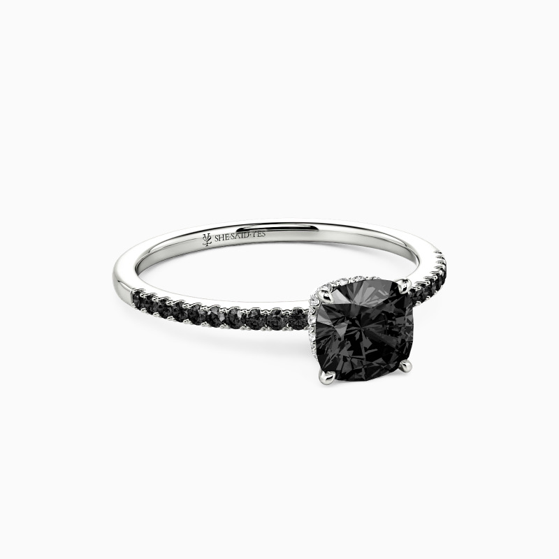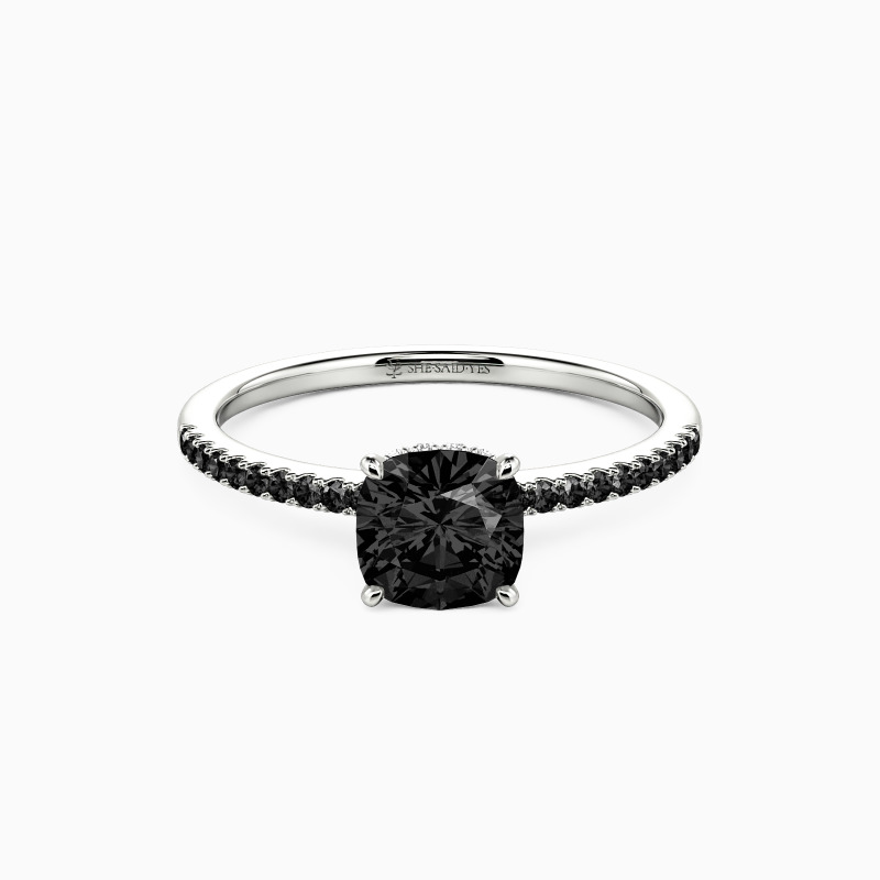 Never out of date, this engagement ring features a glittering cushion cut stone nestled into a floral hidden halo setting; micro paves line the shank on each side for additional sparkle. If you don't know which style to choose, this one is never wrong.