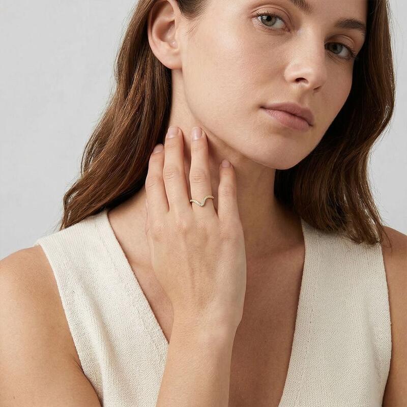 This exquisite wedding band is a testament to modern sophistication. Its sculptural, curved silhouette creates a striking visual impact, embodying the fluidity of life's journey. The bright-cut pavé adds a touch of brilliance, catching light from every angle. This band symbolizes the continuous, shimmering path of marital bliss.
